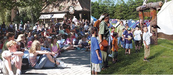 Ab dem späten Nachmittag ist dann "Natur pur" angesagt. Auf der großen Waldwiese vor dem Wildparadies bauen die Jugendlichen ihre Zelte auf. Ein Wildhüter führt durch das abenteuerliche Programm. Trapper sind ebenfalls vor Ort und demonstrieren, wie man ohne Hilfsmittel Feuer macht oder aus einem Stück Holz eine Schale brennt.