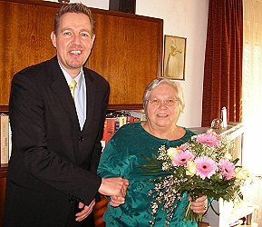 Alexander Schäfer, Truma Verkaufsleiter Südwest, überraschte Marianne Essig mit der frohen Botschaft und überreichte ihr einen Blumenstrauß mit Glückwünschen.