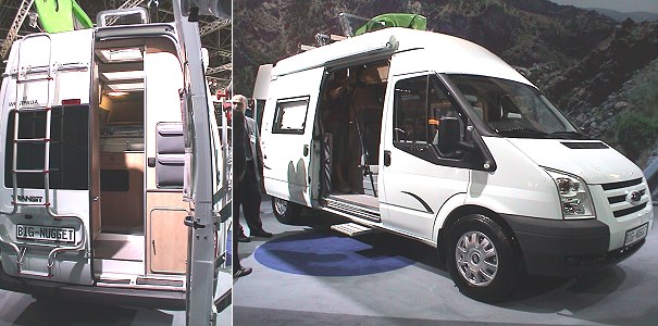 Kastenwagen-Ausbau mit vollwertiger Nasszelle (Fotos:Richter)(hr) Mit dem "Big-Nugget" zeigt Westfalia Van Conversion auf dem Caravan Salon in Düsseldorf eine neue Variante des bewährten Kastenwagen-Ausbaus. Die Serienkarosserie des Ford Transit mit langem Radstand wurde dabei sogar mit einer vollwertigen Nasszelle samt Duschmöglichkeit ausgestattet. 84 Liter Frischwasser (plus 10 Liter Boilervolumen) sorgen für Autarkie. Die Nasszelle befindet sich im Heck und kann auch als Fahrzeugeinstieg, z.B. bei Regenwetter oder beim Wintercamping, genutzt werden. Ausgelegt ist der Big-Nugget zunächst für zwei Personen. Ein nachrüstbares Dachbett mit zwei weiteren Schlafplätzen soll im kommenden Jahr folgen.