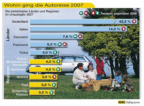 Deutsche Autofahrer bevorzugen Deutschland (Infogramm: ADAC)(red) (adac) Urlaub in Deutschland war auch 2007 wieder sehr gefragt. Mit deutlichem Abstand ist die Bundesrepublik (42,3 Prozent) das beliebteste Reiseziel der Autourlauber - vor Italien (14,0 Prozent), Österreich (7,6 Prozent) und Frankreich (5,3 Prozent). Weiter im Kommen ist die Türkei (4,0 Prozent), die erstmals unter den Top-Five zu finden ist. Zu diesem Ergebnis kommt der ADAC-Reiseservice, der im letzten Jahr 3,1 Millionen Routenberechnungen für seine Mitglieder erstellt hat.