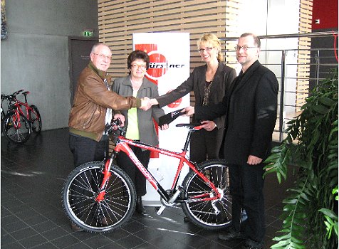V.l.: Roland Schreiber, Veronika Schreiber, Angelika Frey, Bürstner Marketing, Wilfried Leupolz, Leiter des Bürstner-Servicecenters. (Foto: Bürstner GmbH)(red) "Das gibt es ja nicht, ich habe doch noch nie etwas gewonnen." Genau dies war die Reaktion von Veronika Schreiber, als sie telefonisch von ihrem Glück erfuhr. Denn beim diesjährigen Gewinnspiel der Bürstner GmbH wurden die Eheleute Schreiber aus Walzbachtal, aus über 1.000 Teilnehmern, als glückliche Hauptgewinner gezogen. Beim Gewinn handelte es sich um ein Ghost Mountainbike "bürstner edition". Und dieses Fahrrad wurde nun im Rahmen einer kleinen Feier im Bürstner- Servicecenter an die Familie Schreiber übergeben. Beim Besuch stellte sich heraus, dass das Ehepaar sowohl im Sommer als auch im Winter begeistert mit ihrem Bürstner-Reisemobil quer durch Europa unterwegs ist. Das sportliche Ehepaar freut sich nun schon sehr auf eine baldige Geländetour mit ihrem hochwertigen Bürstner-Mountainbike.