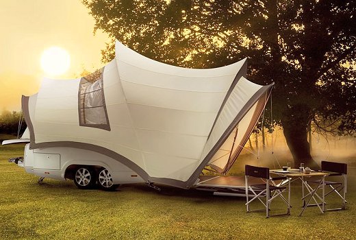 Design trifft Camping (Foto: Messe Düsseldorf)(red) Das Außendesign inspiriert von der Oper in Sydney, Innenausstattung und Komfort wie auf einer Luxusyacht: Der Faltcaravan Opera des holländischen Unternehmens Ysin, der beim Caravan Salon Düsseldorf Premiere feiert, ist auf den ersten Blick kaum als Caravan zu erkennen. Zusammengefaltet in einem unscheinbaren, stromlinienförmigen Hänger von gerade mal 4 mal 1,80 Meter verstaut, entfaltet sich auf Knopfdruck ein Zeltcaravan von 7 mal 3 mal 3,5 Meter.