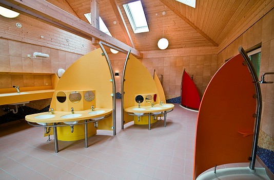 Die Installationen der Einrichtung wurden konsequent an den Bedürfnissen der kleinen Gäste bis sechs Jahre ausgerichtet. Duschen und Waschtische in verschiedenen Höhen sowie Bademöglichkeiten für Kleinkinder mit Wärmelampen sind in dem einmaligen Design integriert, dass den Kindern ein Gefühl von buntem Spielplatz vermittelt, in dem die Körperpflege Spaß macht. Bei der Einweihungsfeier bekamen die Kinder zur Begrüßung eine neue Zahnbürste und Duschartikel.