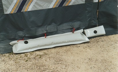 PVC-Schläuche statt Heringe (Foto:Beisel-Schutzdachbau)(hr) Eine Befestigungsmöglichkeit für Vor- und Steilwandzelte als Alternative zu Heringen bietet die Firma Beisel-Schutzdachbau. "Sneakie" heißen die mit Wasser befüllbaren PVC-Schläuche, die an den Bodenschürzen der Zelte befestigt werden und diese durch ihr Gewicht sicher am Boden halten sollen. "Sneakie" bietet sich besonders auf kritischen Böden wie Sand oder Fels an. Das Material ist seewasserbeständig, so dass die Schläuche auch direkt am Strand aus dem Meer befüllt werden können.