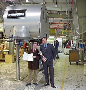 T@b-Produktion ist angelaufen Knaus-Vorstand Thomas Dickenberger (r.) und Produktbereichsleiter Hubert Brandl beim Produktionsstart der neuen "Knutschkugel". (Foto:Tabbert)(hr) Pünktlich zur neuen Caravan-Saison ist am Tabbert-Standort in Sinntal-Mottgers die T@B-Produktion angelaufen. Thomas Dickenberger, Vorstandsvorsitzender der Knaus AG, und Hubert Brandl, Produktbereichsleiter Tabbert, ließen es sich nicht nehmen, den ersten T@B persönlich bei seinem Stapellauf zu begleiten.
