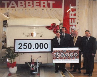 Eine viertel Million Caravans ausgeliefert (Foto:Tabbert)(hr) Am 25.Februar um genau 14.20 Uhr war es so weit: Eine "Comtesse 560 E" lief als 250.000 Tabbert-Caravan vom Band. Dem denkwürdigen Moment in der erfolgreichen Unternehmensgeschichte wohnten neben Gästen aus der Politik und Firmenvertretern auch der Vorstandsvorsitzende der TIAG Tabbert-Industrie AG, Thomas Dickenberger, und der Vertriebsleiter der Knaus Tabbert Group, Reinhard Hoßfeld, bei.