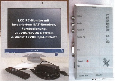 Wer bereits einen LCD-Monitor und SAT-Receiver besitzt, kann die Conbox 1.0 von ALL-COM einsetzen. Sie bereitet das Video-Signal für die Wiedergabe auf dem PC-Monitor auf und verfügt ebenfalls über eine Scart-Buchse zum Anschluss zusätzlicher Video-Quellen sowie einen PC-Anschluss. Die Conbox 1.0 ist für 198 Euro zu haben.