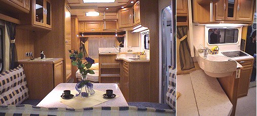 Neuer Grundriss mit Kopierschutz Die Eck-Küche ist im Vivaldi 450 TDkompakt teilweise über das Bett gebaut. (Fotos:Richter)(hr) Einen neu entwickelten Wohnwagen-Grundriss stellt Tabbert auf der Messe CMT in Stuttgart aus: Das Modell Vivaldi 450 TDkompakt präsentiert sich als neues "Raumwunder". Bei einer Aufbaulänge (inkl. Flaschenkasten) von 540 cm bietet er ein komfortables Doppelbett, ein großzügiges Bad, eine Rundsitzgruppe und eine über Eck gebaute Küche. Platz gewinnt Tabbert durch den diagonal angeordneten Mittelgang und den teilweisen Überbau der Küche über das Doppelbett. Die Tabbert-Entwickler sind von ihrem neuen Grundriss derart überzeugt, dass sie ihn per Gebrauchsmusterschutz vor Nachahmern gesichert haben.